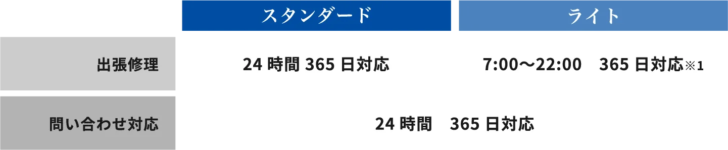 - ※1 受付時間や弊社保守拠点からお客さま事業所、お客さま拠点までの距離により、22時までにお客さま事業所、お客さま拠点への訪問が困難と弊社が判断した場合、翌日以降の修理をご案内させていただきます。
